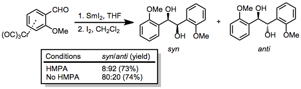 Finally, the chromium tri(carbonyl) moiety serves as a sterically bulky group in reactions of arene chromium complexes, preventing the approach of a reagent endo to chromium. In addition, ortho-substituted aromatic aldehydes and styrenes prefer to adopt a conformation in which the doubly bound oxygen or carbon is pointed away from the ortho substituent. As a result, only one face of the double bond is exposed on the exo face of the aromatic ring. If this were not the case, addition to styrenes and aromatic aldehydes would not be diastereoselective, despite the presence of the chromium tri(carbonyl) group. The ortho substituent is necessary for high stereoselectivity; meta-substituted arenes exhibit very low diastereoselectivity.[3]