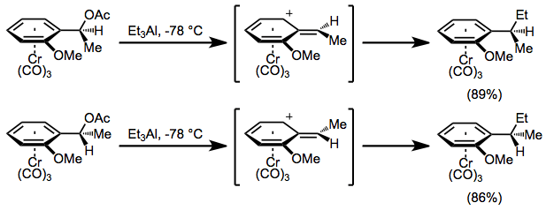 Benzylic cations of chromium arene complexes are conformationally stable, and undergo only exo attack to afford SN1 products stereospecifically, with retention of configuration.[7] Propargyl[17] and oxonium[18] cations undergo retentive substitution reactions, and even β carbocations react with a significant degree of retention.[19]