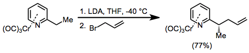 Benzylic anions of chromium arene complexes exhibit similar reactivity to cations. They are also conformationally restricted and undergo substitution reactions with retention of stereochemistry at the benzylic carbon. In the example below, complexation of the pyridine nitrogen to lithium is essential for high stereoselectivity.[20]