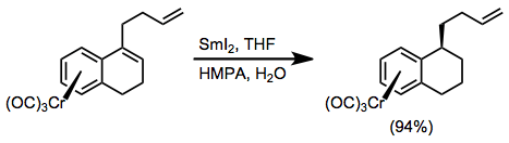 Diastereoselective reduction of styrenes is possible with samarium(II) iodide. A distant alkene is untouched during this reaction, which provides the reduced alkylarene product in high yield.[22]