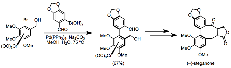 A key step in the synthesis of (–)-steganone involves the enantioselective cross-coupling of a chromium haloarene complex with a boronic acid to afford an axially chiral intermediate with a configuration that matched the target. Elaboration of the arene side chains then afforded that of the target.[26]