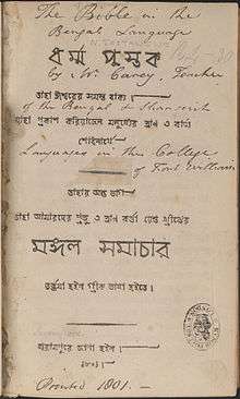 Nathaniel B. Halhead of the East India Company published a Bengali grammar for British officials in 1776.[1] William Carey of Serampore translated the Bible into the Bengali language and published it in 1793 and 1801.[2][3] The high language Bengali translation in use in Bangladesh is derived from Carey's version, while "common language" versions are newer translations.[4]