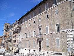 The library was established by bequest of Luciano Benincasa in 1669, whose will states that his private collection is to be made accessible to public use.[1] In 1749, Eleonora Vincenzi gave the library to the municipality of Ancona, and it was moved from the palace of the Benincasa family to the palace of the Elders.[2] After 1800 the provincial archive was established in Ancona.[3] In 1861, because of French rule over the city, the religious orders were suppressed, and their book collections were transferred to the municipal library; as a result the library collections significantly increased. In 1883 the library was moved to the high school gymnasium 'Carlo Rinaldini'. In 1911 the historical archive was merged with that of the municipality, and in 1925 moved again to the former convent of San Francesco delle Scale. During World War II the convent of San Francesco was destroyed as a result of British bombing (1943/1944), and the historical collections – with their nineteenth-century inventories – suffered serious damage. After the war the City bought the Casa Mengoni-Ferretti, and in 1950 the library was reopened in the new premises.[2] The historical archive, first merged in 1971, was moved from the State archives.