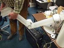 Early on in the development process, Hall and the design team took a research trip to Carnegie Mellon University's Robotics Institute, where they met a team of DARPA-funded[48] researchers who were pioneering the new field of 'soft robotics' using inflatable vinyl,[49][50] which ultimately inspired Baymax's inflatable, vinyl, truly huggable design.[51][52][53] Hall stated that "I met a researcher who was working on soft robots. ... It was an inflatable vinyl arm and the practical app would be in the health care industry as a nurse or doctor's assistant. He had me at vinyl. This particular researcher went into this long pitch but the minute he showed me that inflatable arm, I knew we had our huggable robot."[54] Hall stated that the technology "will have potential probably in the medical industry in the future, making robots that are very pliable and gentle and not going to hurt people when they pick them up."