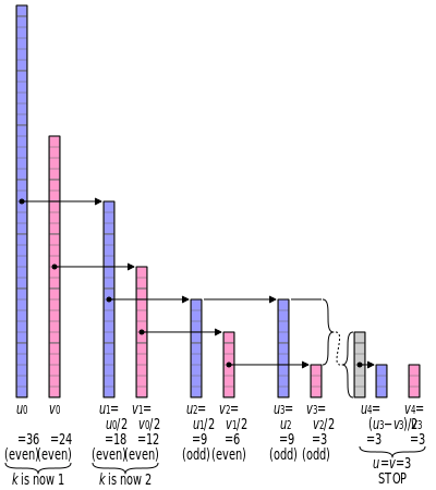 - Repeat steps 2–4 until u = v, or (one more step) until u = 0. In either case, the GCD is 2kv, where k is the number of common factors of 2 found in step 2.