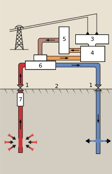 Key: 1 Wellheads 2 Ground surface 3 Generator 4 Turbine 5 Condenser 6 Heat exchanger 7 Pump
