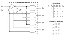 In digital electronics, a binary decoder is a combinational logic circuit that converts a binary integer value to an associated pattern of output bits. They are used in a wide variety of applications, including data demultiplexing, seven segment displays, and memory address decoding.