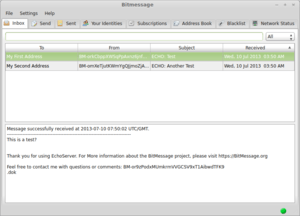 - ↑ "Bitmessage E-Mail Gateway". Retrieved 7 July 2015.