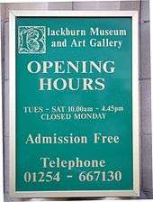 The Blackburn Museum and Art Gallery is the local museum service for the borough of Blackburn with Darwen Borough Council.[1] It is a museum with collections of Christian icons, Egyptian hieroglyphs, and local history, as well as those of the former Lewis Textile Museum.