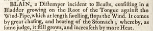 According to Ephraim Chambers' eighteenth-century Cyclopaedia, or an Universal Dictionary of Arts and Sciences, blain was "a distemper" (in the archaic eighteenth-century sense of the word, meaning "disease") occurring in animals, consisting in a "Bladder growing on the Root of the Tongue against the Wind-Pipe", which "at length swelling, stops the Wind". It was thought to occur "by great chafing, and heating of the Stomach".