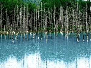 Blue Pond (青い池 Aoi-ike) is a man-made water feature in Biei, Hokkaido, Japan. It is the result of works on the Biei River (美瑛川), carried out after the 1988 eruption of Mount Tokachi, to protect the town of Biei from volcanic mudflows. The colour is thought to result from the accidental presence of colloidal aluminium hydroxide in the water.[1][2] Damage caused by Typhoon Mindulle in August 2016 resulted in a temporary drop in the water level and in the colour briefly turning brown with mud and sand from the Biei River.[3]