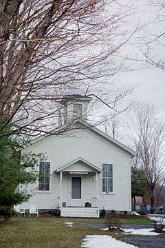 Borodino District School #8, known previously as Borodino District School #11, was listed on the National Register of Historic Places in 2007.[1] The one-room schoolhouse was probably built between 1853, when the property was sold to the school trustees and 1859 when it first appears on a map of Borodino. It is a clapboard building in the Italianate style topped by a square cupola with a gabled roof. The interior is a single room with a twelve foot ceiling. The walls and ceiling are beaded board. Two chalkboards are still in evidence. The school closed in 1956, probably due to the lack of running water and proper toilet facilities required by law after that time.[2]