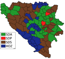 | Banja Luka | SDS won 41% of votes, SDA and HDZ combined for 33%, and the rest (26%) was divided by smaller parties |