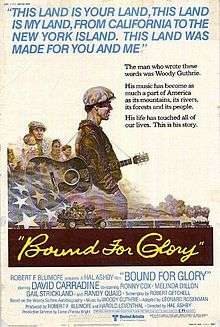 Bound for Glory is a 1976 American film directed by Hal Ashby and loosely adapted by Robert Getchell from Woody Guthrie's 1943 autobiography Bound for Glory. The film stars David Carradine as folk singer Woody Guthrie and Ronny Cox, Melinda Dillon, Gail Strickland, John Lehne, Ji-Tu Cumbuka and Randy Quaid.[2]