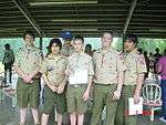 Scouts and adult leaders wear the Boy Scout uniform.[14] It generally consists of a khaki button-up shirt, olive green pants or shorts, belt, and neckerchief. The Scouter dress uniform is appropriate for professional Scouters and Scouting leaders on formal occasions.[15]