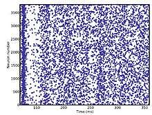 Sample raster plot from randomly connected network of integrate and fire neurons with exponential inhibitory and excitatory currents.
