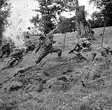 The division returned to the England on 4 February 1943, and was placed under the command of XI Corps and based in Essex.[37][43] Between 4–12 March, the division participated in Exercise Spartan; the largest military exercise ever held in the United Kingdom. David French commented that the exercise "was designed to analyse the problems that would arise after a force had landed on a hostile shore and was advancing from a bridgehead." The exercise revealed weaknesses in elements of the senior leadership, in particular the officers in overall command of the armies deployed for the exercise, and highlighted the improvements made in general by the infantry.[44] In May, the division was transferred to II Corps and moved to Kent following-which Major-General Charles Wainwright took command.[18][43] The division was earmarked for a role in Operation Overlord[45] and Marcus Cunliffe wrote that Exercise Spartan "seemed to be every indication that" the division was to be a front-line unit.[43] In September, the division in conjunction with the 1st Polish Armoured Division was placed under the control of II Canadian Corps for Exercise Link.[46] In the months following the exercise, the division was relegated to 'Lower Establishment' status.[43][45] This meant that the division was now to be strictly used for home defence in a static role compared to 'Higher Establishment' divisions that were intended for deployment overseas and combat.[47][48][49] As part of this change in priorities, the division also became a training formation and one intended to find suitable replacements for fighting formations.[39][45] By October, the division had also been assigned to anti-invasion duties in Kent.[50] While based there, German cross-Channel guns periodically shelled the area, and in 1944 V-1 flying bombs became a minor issue.[51] In December 1943, the division (reinforced, for the exercise, by the 31st Tank Brigade) played the defending force in Exercise Vulcan; a four-day training exercise aimed at improving the attacking process of the 43rd (Wessex) Infantry Division.[52]
