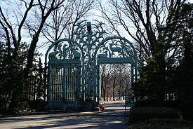 Heins & LaFarge designed the original permanent buildings as a series of Beaux-Arts pavilions grouped around the large circular sea lion pool.[12] In 1934, the Rainey Memorial Gates, designed by noted sculptor Paul Manship, were dedicated as a memorial to noted big game hunter Paul James Rainey.[13] The gates were listed on the National Register of Historic Places in 1972.[14]