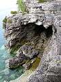 The harder dolomite limestone stones forms much of the rock of the escarpment cliffs along Bruce Peninsula National Park's Georgian Bay shoreline. As at Niagara Falls, the dolomite "caprock" erodes more slowly than the rock below it, creating the sculptured cliffs for which the area is famous. Since the last Ice Age, water levels in the region have undergone great changes. Softer limestone has been eroded away by water action, leaving magnificent overhanging cliffs at various points along the shore. These are the big attraction of the Cyprus Lake trails. Where erosion has cut more deeply, caves have been formed, such as the famed "Grotto" on the shore between the Marr Lake and Georgian Bay Trails. Great blocks of dolomite, undercut by wave action, have tumbled from the cliffs above and can be clearly seen below the surface of the deep, clean waters of Georgian Bay.