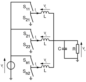 The multiphase buck converter is a circuit topology where basic buck converter circuits are placed in parallel between the input and load. Each of the n "phases" is turned on at equally spaced intervals over the switching period. This circuit is typically used with the synchronous buck topology, described above.