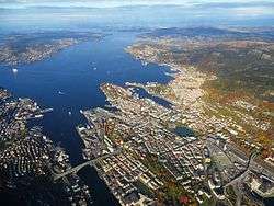 Byfjorden (Norwegian Nynorsk and Bokmål: /byːfjɔrn/, /-ɔɾn/; Bokmål: also /-ɔɳ/; Bergensk: usually /-ɔʁn/) is a fjord in Hordaland county, Norway. The 15-kilometre (9.3 mi) long fjord separates the island of Askøy from the mainland Bergen Peninsula, flowing right past the city of Bergen on the mainland. The western entrance to Byfjorden is between the village of Drotningsvik in Laksevåg borough, Bergen, and the village of Marikoven on the island of Askøy in Askøy municipality. The northern entrance to the fjord is between the village of Ask on Askøy and Mjølkeråen in the borough of Åsane in Bergen. On the northern end, it connects with the Salhusfjorden and Herdlefjorden.[1] There is one road crossing over the Byfjorden: the Askøy Bridge, which crosses near the western end of the fjord. The name literally means city-fjord, and it is so named because of its importance as a transportation route into and out of the city of Bergen.[2]