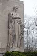 Inspired by Parks Commissioner Robert Moses’s desire to provide a World War II monument to each borough, this monument was created. It is a granite and limestone 24-foot-tall (7.3 m) memorial designed by Stuart Constable, Gilmore D. Clarke, and W. Earle Andrews, who worked in concert with the architectural firm of Eggers and Higgins.[3] The two larger-than-life sized high relief figures by sculptor Charles Keck (1875–1951) are located on the south facade, at opposite ends of the building. It honors Brooklynites who served in World War II. The full plan, however, was never fully built because of lack of funding.[3]