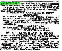 Mary Goodwin Buckston, John’s sister, was born Mary Goodwin Johnson. She married Rev Henry Thomas Buckston (1807-1842) in 1832[5]and the couple had two sons Henry and George. When Mary inherited Callow Hall in 1873 she lived there until her death in 1880[6] and the property was inherited by her son Rev Henry Buckston (1835-1916). He was the vicar at Hope, Derbyshire for over thirty years and so Callow Hall was rented during this time. After his retirement in 1903 he and his wife Eliza Amy went to live at Sutton-On-the Hill which was another property that he owned. He died in 1916 and his widow Eliza Amy Buckston (1846-1926) moved to Callow Hall.[7] When she died in 1926 the Hall was put on the market. The sale notice is shown. Arthur Frederick Longdon bought the property.