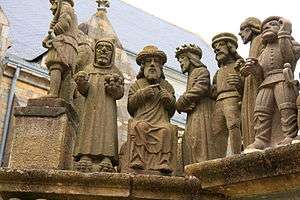 The Calvary of Plougastel-Daoulas in the arrondissement of Brest comprises a raised octagonal pedestal made from the yellow granite of Logonna-Dāaoulas, flanked by four thick arched buttresses. All the sculptural work is by the Maître de Plougastel except the horseman on the left of the crucifix which is by Millet.[1]