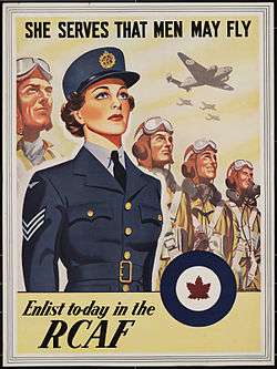 The Canadian Women's Auxiliary Air Force (CWAAF) was formed in 1941 as an element of the Royal Canadian Air Force (RCAF). Changing to the Women's Division (WD) in 1942, this unit was formed to take over positions that would allow more men to participate in combat and training duties. The original 1941 order-in-council authorized "the formation of a component of the Royal Canadian Air Force to be known as the Canadian Women's Auxiliary Air Force, its function being to release to heavier duties those members of the RCAF employed in administrative, clerical and other comparable types of service employment."[32] Among the many jobs carried out by WD personnel, they became clerks, drivers, fabric workers, hairdressers, hospital assistants, instrument mechanics, parachute riggers, photographers, air photo interpreters, intelligence officers, instructors, weather observers, pharmacists, wireless operators, and Service Police. Although the Women's Division was discontinued in 1946 after wartime service, women were not permitted to enter the RCAF until 1951.[33]
