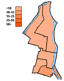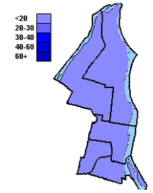 The eastern end of the Island of Montreal was the birthplace of the sovereigntist movement, and remained a sovereigntist stronghold for four decades. Even today, when the Parti Québécois wins provincially, the entire eastern half of the island is coated light blue. Federally, it was the Bloc Québécois's power base from 1993 to 2011, partly due to its leftist bent. With the exception of ethnic areas that protrude from Northern Montreal into the East Island's Honoré-Mercier riding, where Liberal support is strong, the area is relatively homogeneously Francophone and lower-income, a recipe for Bloc dominance. Prior to the rise of the Bloc, the region voted solidly Liberal for decades before being swept up in the Brian Mulroney tide, electing Quebec nationalists under the Progressive Conservative banner. The Conservative Party of Canada has never approached this level of support, and eastern Montreal is currently the weakest region in Canada for the Tories. In 2011, the federalist NDP swept every seat in this region amid the surge of popular support in the province and the concurrent Bloc meltdown, in all but one case by well over 6,000 votes. The NDP surge even cost longtime Bloc leader Gilles Duceppe his seat in Laurier-Sainte-Marie.