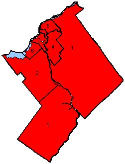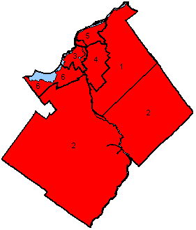 Map of the region's ridings. Colours show the result after the 2006 and 2008 elections which had the same seat results |