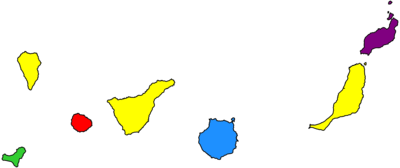 | Island-level units won by CC (yellow), PP (blue), PSOE (red), PCN (purple) and AHI (green) |