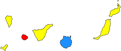 | Island-level units won by PP (blue), CC (yellow) and PSOE (red) |