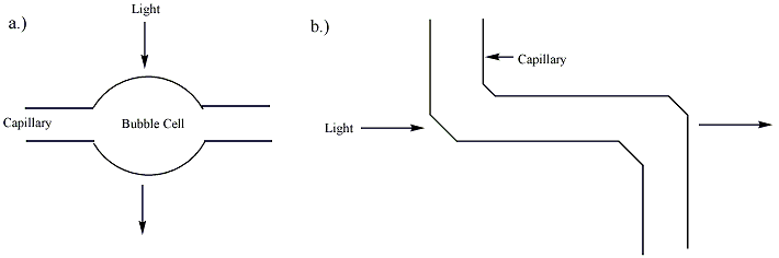 Separation by capillary electrophoresis can be detected by several detection devices. The majority of commercial systems use UV or UV-Vis absorbance as their primary mode of detection. In these systems, a section of the capillary itself is used as the detection cell. The use of on-tube detection enables detection of separated analytes with no loss of resolution. In general, capillaries used in capillary electrophoresis are coated with a polymer (frequently polyimide or Teflon) for increased flexibility. The portion of the capillary used for UV detection, however, must be optically transparent. For polyimide-coated capillaries, a segment of the coating is typically burned or scraped off to provide a bare window several millimeters long. This bare section of capillary can break easily, and capillaries with transparent coatings are available to increase the stability of the cell window. The path length of the detection cell in capillary electrophoresis (~ 50 micrometers) is far less than that of a traditional UV cell (~ 1 cm). According to the Beer-Lambert law, the sensitivity of the detector is proportional to the path length of the cell. To improve the sensitivity, the path length can be increased, though this results in a loss of resolution. The capillary tube itself can be expanded at the detection point, creating a "bubble cell" with a longer path length or additional tubing can be added at the detection point as shown in figure 2. Both of these methods, however, will decrease the resolution of the separation.[3] Post-column detection utilizing a sheath flow configuration has also been described.