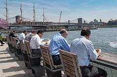 The East River waterfront in Lower Manhattan was known for heavy maritime activity, with over 40 piers in operation by the later 1950s.[30] The busy waterfront provided easy access to New York Harbor and the Atlantic Ocean in the south, the Hudson River on the west, with a connection to the Erie Canal. However, the rise of truck traffic and the transfer of port activity to the Port Newark-Elizabeth Marine Terminal drastically reduced maritime traffic on the river after the middle 20th century. With many piers now defunct, ambitious plans have been made to reclaim and reuse the pier space. The north-south arterial highway, the FDR Drive, was moved to an elevated location to allow convenient access to the piers.[31][32] In the 1970s, the Water Street Access Plan was drafted to extend the confines of the traditional Financial District eastward and create a new business corridor along Water Street, south of Fulton Street. Noting the success of the World Financial Center, the East Side Landing plan was created in the 1980s to add commercial and office buildings along the waterfront, again south of Fulton Street, similar to Battery Park City. This plan never materialized.[30]