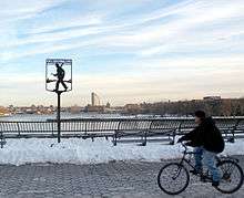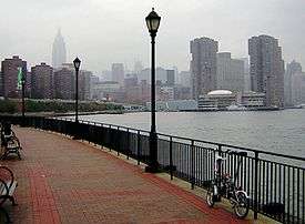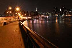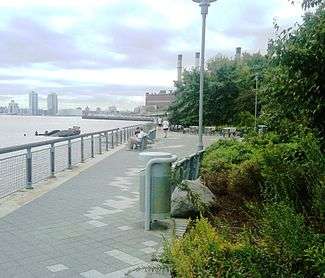 The East River Greenway (also called the East River Esplanade) is an approximately 9.44-mile-long (15.19 km) foreshoreway for walking or cycling on the east side of the island of Manhattan on the East River. The largest portions are operated by the New York City Department of Parks and Recreation. It is separated from motor traffic, and many sections also separate pedestrians from cyclists. The greenway is parallel to the Franklin D. Roosevelt East River Drive for a majority of its length.