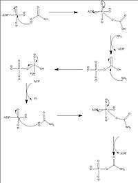 It has been found that both ATP-binding sites in the large subunit of CPSI are structurally equivalent. A recent study has investigated the interlinking between these two domains (domain B and domain C) and has found evidence that they are coupled. This ATP-binding domain coupling works in a way such that a molecule of ATP binding at one site (domain C) conformationally allows synthesis at the other domain (domain B). If this is the case, carbamoyl phosphate is, in fact, not formed in step 5 (of the included mechanism below) by ejecting ADP but rather in step 4 by protonating the alcohol group and then kicking it off as water.[6]