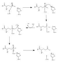 Of these four steps, only step two - the deamination of glutamine to get ammonia - is known to have actively participating amino acid residues, Cys269 and His353. The other three steps mostly utilize amino acid residue to form hydrogen bonds with substrates. A video of a simplified version of this mechanism is available here