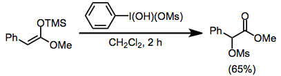 Silyl enol ethers undergo many of the same reactions as carbonyl compounds in the presence of iodine(III) reagents. α-Alkoxylation is possible in the presence of an external alcohol nucleophile, although yields are somewhat variable.[13]