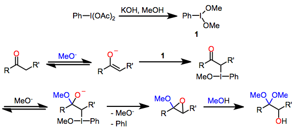Under protic conditions, ketones undergo α-hydroxylation and dimethyl acetal formation. Both iodosylbenzene and iodobenzene diacetate (IBD) can effect this transformation. This method can be used to synthesize α-hydroxy ketones after acidic hydrolysis of the ketal functionality.[10]