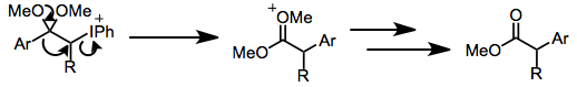 In some cases, rearrangements complicate hypervalent iodine oxidations of carbonyl compounds. Aryl migration may occur under acidic conditions, yielding α-aryl esters from enol ethers.[7] Favorskii rearrangements have also been observed, and these have been particularly useful for steroid synthesis.[16]
