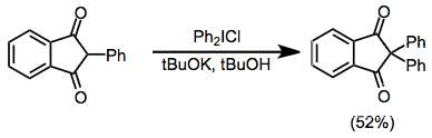 In the presence of diaryliodonium salts, enolates undergo α-arylation. Bulky diaryliodoniums react more slowly, and enolate homocoupling (see equation (10) below) begins to compete as the aromatic ring is substituted.[11]