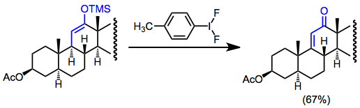 Oxidative functionalization of silyl enol ethers in low concentration (to avoid homocoupling) without an external nucleophile leads to dehydrogenation. This can be a useful way to generate α,β-unsaturated carbonyl compounds in the absence of functional handles. For instance, dehydrogenation is employed in steroid synthesis to form unsaturated ketones.[17]