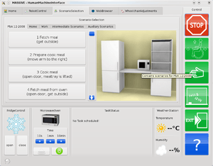 The tasks is selected and started by the user via the HMI, depicted in Fig. 4, on a high level of abstraction, e.g. "cook meal". After initial monitoring to define the current state of the system and the environment, the tasks execution is performed and a list of elementary operations are created which can be executed autonomously by the system. These elementary operations consists of, e.g. image processing algorithm to recognize objects in the environment or manipulative algorithms to calculate a special trajectory to grasp an object.