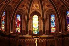 The first Catholic church in Boise was dedicated on Christmas Eve 1870, but was destroyed in a fire 18 days later.[2] Another frame structure was built that would serve as the cathedral of the Vicariate Apostolic of Idaho, established March 5, 1883, and the Diocese of Boise after it was established on August 25, 1893.[3] It was located on the northwest corner of Ninth and Bannock Streets.[4] As the city grew, a larger cathedral was needed and Bishop Alphonse Glorieux purchased property bounded by Fort, Hays, Eighth, and Ninth Streets. He laid the cornerstone for the present cathedral in 1906. So as not to be a financial drain on the parish, the church building was built in stages. After the lower level was completed the parish worshiped there. The walls and roof were completed in 1912, and the cathedral was completed in 1921 during the episcopate of Bishop Daniel Gorman, who dedicated it on March 27, Easter Sunday.
