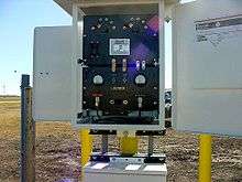 The DC power source would typically have a DC output of up to 50 amperes and 50 volts, but this depends on several factors, such as the size of the pipeline and coating quality. The positive DC output terminal would be connected via cables to the anode array, while another cable would connect the negative terminal of the rectifier to the pipeline, preferably through junction boxes to allow measurements to be taken.[16]