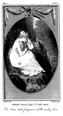 Beginning with her Elegiac Sonnets in 1784, Smith included autobiographical material in her works, relaying “a saga of her own marital unhappiness, poverty and anxiety about her children”.[6] Readers purchased her works partially because they wanted to hear the unfolding story of her life. The narratives of Jessy and Sophy contain references to Smith's own life that readers of the Sonnets would have recognised and to which reviewers alluded. For example, Sophy's marriage to a merchant whose wealth was built on the slave trade, her suffering as a mother, and the loss of her children, all parallel Smith's own life.[7] The heroine is widely read and a poet, signalling her connection with Smith.[5] For Celestina, “literature is talismanic, her greatest help in times of trouble”, as it was for Smith.[8] Celestina takes a trip to the Hebrides where she writes poetry and watches her friend's husband die in a shipwreck, mimicking an illustration Thomas Stothard made for the fifth edition of the Sonnets.[9] This section of the novel is particularly redolent with autobiographical references, with Benjamin Smith, Smith's husband, represented by Elphinstone, in a portrait that partially redeems him after his portrayal as Mr. Stafford in Emmeline.[10] In her heroising of the author figure, Smith was helping to create Romanticism.[11]