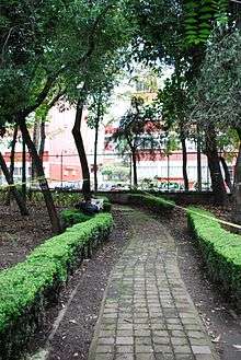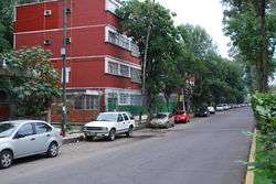The original complex covered an area of 250,000m2. However, construction surface at the ground level only covered 16,000, leaving 80% of the grounds free for parks and sports areas.[5] It contained nineteen buildings of various heights, between three and nineteen floors. These buildings contained a total of 984 apartments of twelve different types to accommodate between 3,000 and 5,000 people.[5][8] The buildings had four types, labeled "A" (largest) "B", "C" and "D", with total apartment floor space of 700,000sq ft.[8] At the Alemán complex, the buildings zigzag over the site, but in the Juarez complex, the buildings are placed at angles to give a greater sense of privacy and to give as much natural light as possible for the apartments.[5][9] There are no vehicular roads within the complex to allow pedestrians to walk around. All of the vehicular roads that enter terminate at a parking lot before one enters where the apartment buildings are.[5] There is only one road that passes through the complex, Orizaba Street, but this road was lowered below ground level, the first time this was done in Mexico City.[1][5] Pani placed four of the "C" type buildings right alongside this underpass to free even more space between the buildings for park and recreational space. About 2,500 trees were planted at the site.[10] These emphasis on space reduced Le Corbusier's recommendation of 1,000 residents per hectare to 240, and would make this the least densely populated of his apartment projects.[11] The apartments were split into two levels, with the kitchen and living room on one floor and the bedrooms above or below. In this way, elevators only had to stop at every third floor. All apartment and elevator access was through open passages. Within the apartments, open space was created by eliminating walls between the living and dining rooms, which was popular in the United States starting in the 1950s and 1960s. Tenants disposed of garbage though chutes to the basement, a novel idea in Mexico at that time.[12]