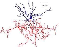 ![]() Reconstruction of a mouse chandelier cell. Soma and dendrites are labeled in blue, axon arbor in red. (Woodruff & Yuste, 2008, PLoS Biology)[1] | |