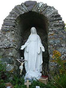 A holy well close to the chapel (51°52′21″N 5°16′06″W / 51.8724°N 5.2683°W) was thought to have healing properties,[3] and to this day visitors throw coins into the well for luck. Records of a survey of St. David's by Browne Willis in 1717 state that "there is a fine Well beside it [St. Non's Chapel], cover'd with a Stone-Roof, and enclos'd within a Wall, with Benches to sit upon round the Well. Some old simple People go still to visit this Saint at some particular Times, especially upon St. Nun's Day (March 2nd) which they kept holy, and offer Pins, Pebbles, Etc at this well",[8] and reports from 1811 state that "the fame this consecrated spring has obtained is incredible and it is still resorted to for many complaints". It was thought to be particularly effective for eye problems and was restored in 1951 by the Catholic Church, which also erected a shrine using stones from nearby ruins. The vaulting over the well replaced ruins of medieval stonework in the 18th century.[9] Water from the well was used by Pope Benedict during his visit to Britain.